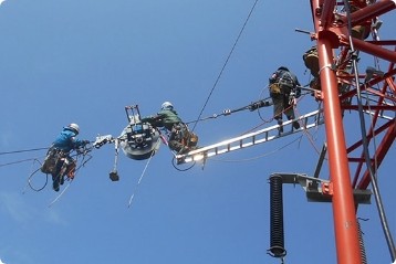 We lay the optical fiber cables built into overhead ground wire sections using the ropeway construction method or the sling method. Electric Power Development Co.,Ltd. and some other electric power companies both domestic and overseas use the method of wrapping the optical fiber around the existing ground wire, and this work is also contributing to the construction of optical communication networks.