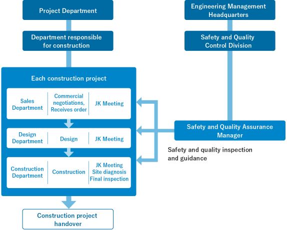 A “Safety and Quality Assurance Manager” belonging to the Safety and Quality Control Division objectively checks the safety and quality assurance at JK meetings, site diagnosis, and final inspections of each project.